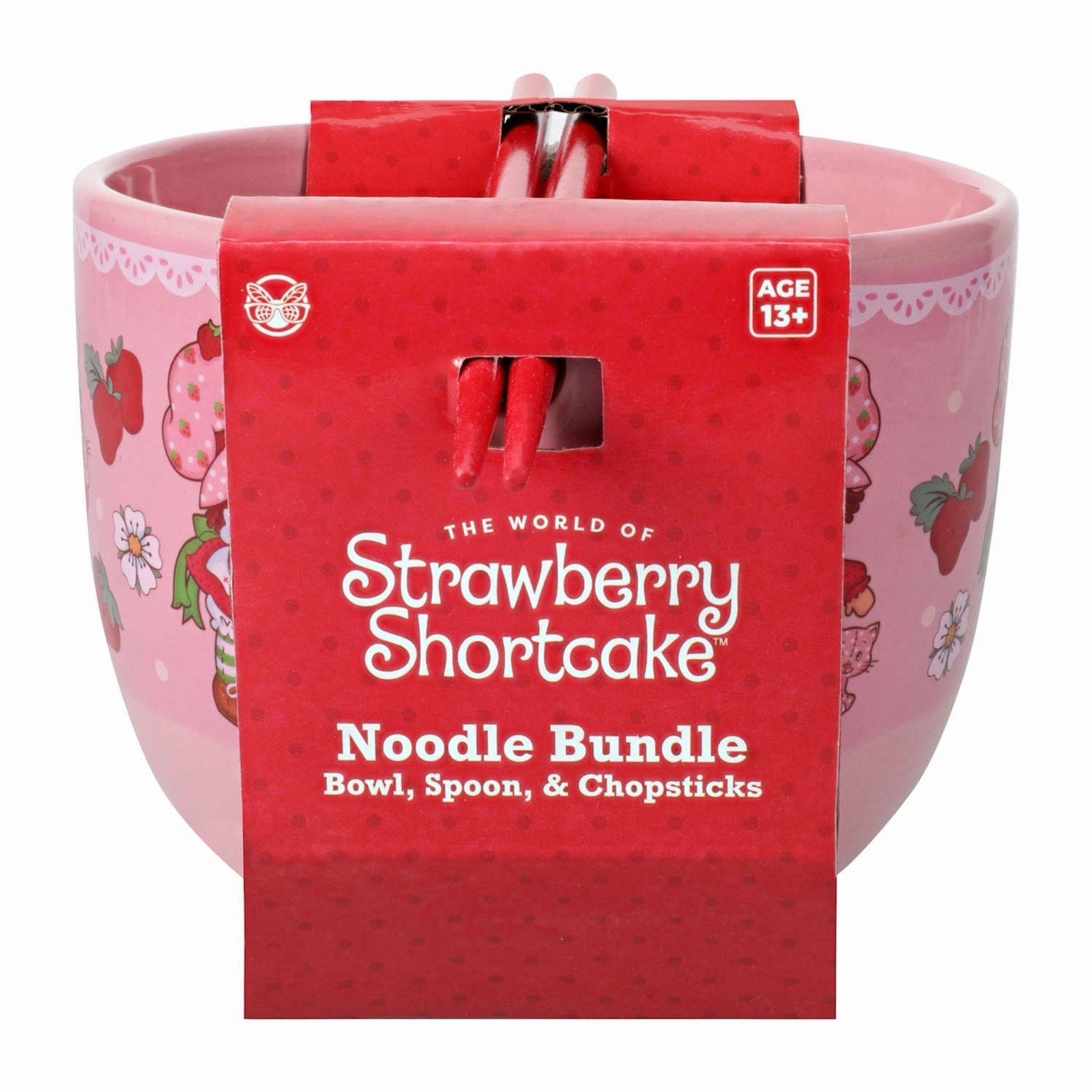 Strawberry Shortcake Pink Ramen Noodle Bowl with a Spoon and Chopsticks.